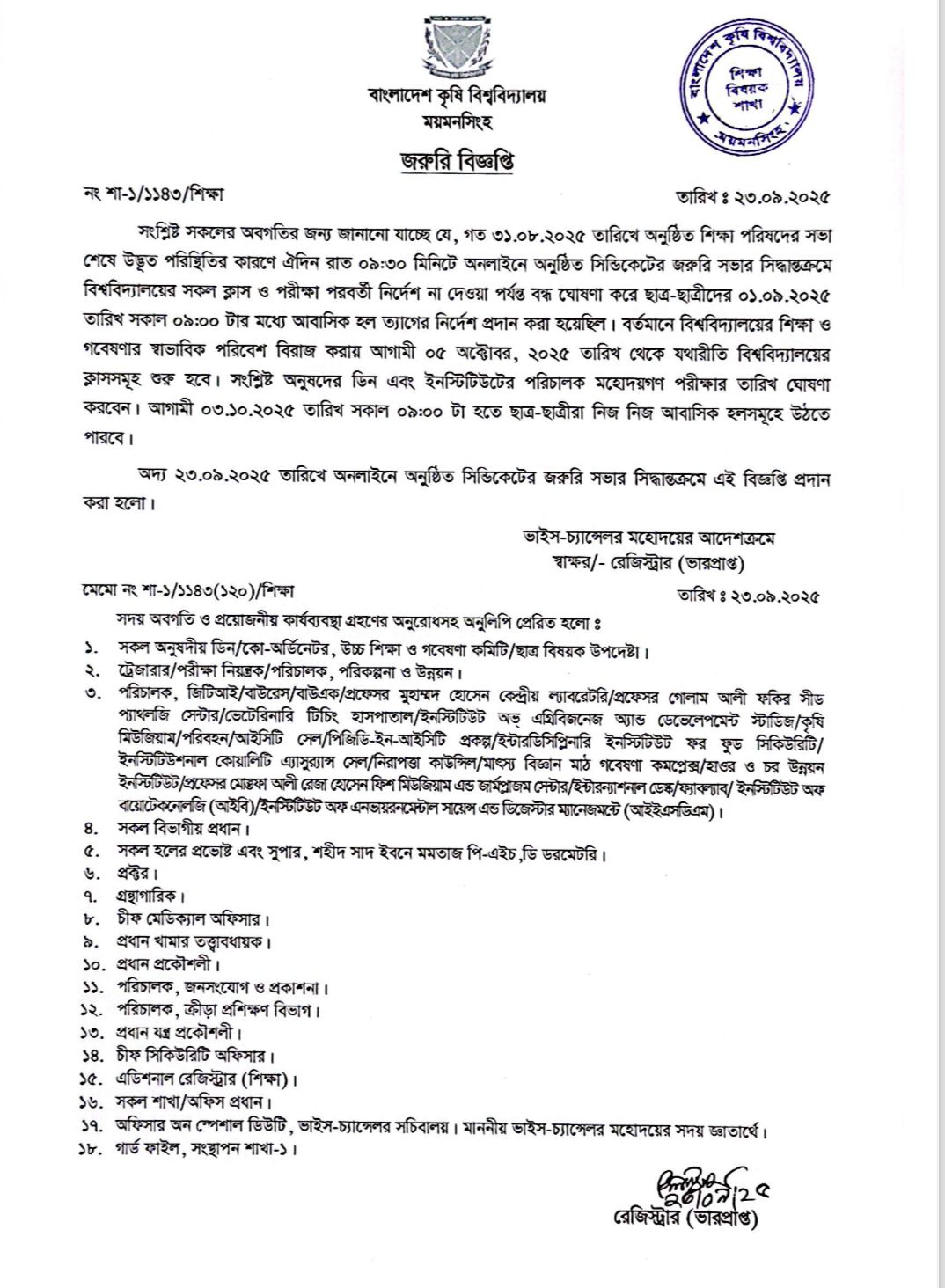 অদ্য ২৩.০৯.২০২৫ তারিখে অনলাইনে অনুষ্ঠিত সিন্ডিকেটের জরুরি সভায় বিশ্ববিদ্যালয়ের আবাসিক হল খোলা ও ক্লাস শুরু হওয়া প্রসঙ্গে গৃহীত সিদ্ধান্ত