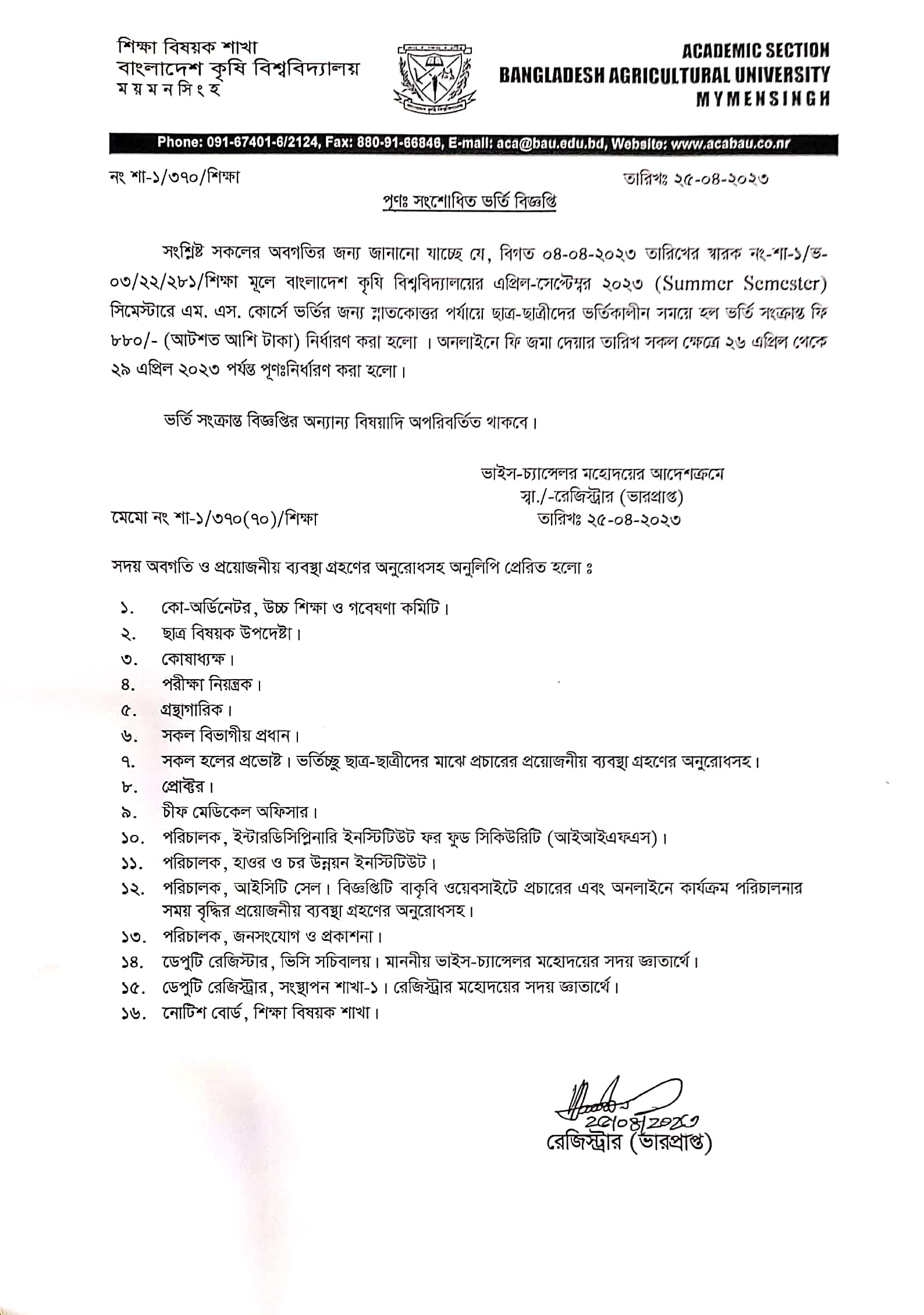 এপ্রিল-সেপ্টেম্বর ২০২৩ (Summer Semester) এম. এস. কোর্সে ভর্তির জন্য ভর্তিকালীন সময়ে হল ভর্তি সংক্রান্ত ফি এবং অনলাইনে ফি জমা দেয়ার সময় পূণঃনির্ধারণ প্রসঙ্গে