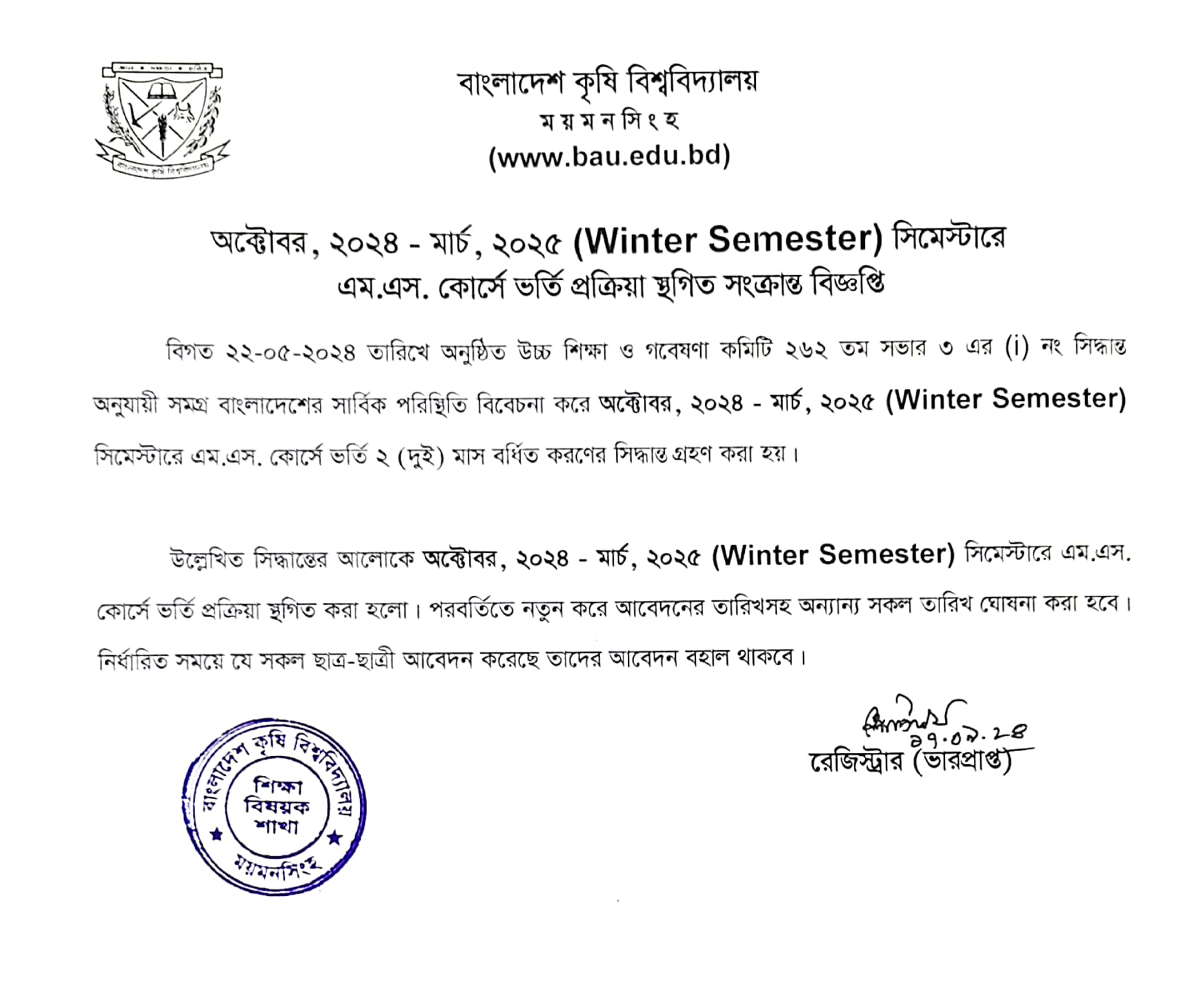 অক্টোবর, ২০২৪ - মার্চ, ২০২৫ (Winter Semester) সিমেস্টারে এম.এস. কোর্সে ভর্তি প্রক্রিয়া স্থগিত সংক্রান্ত বিজ্ঞপ্তি