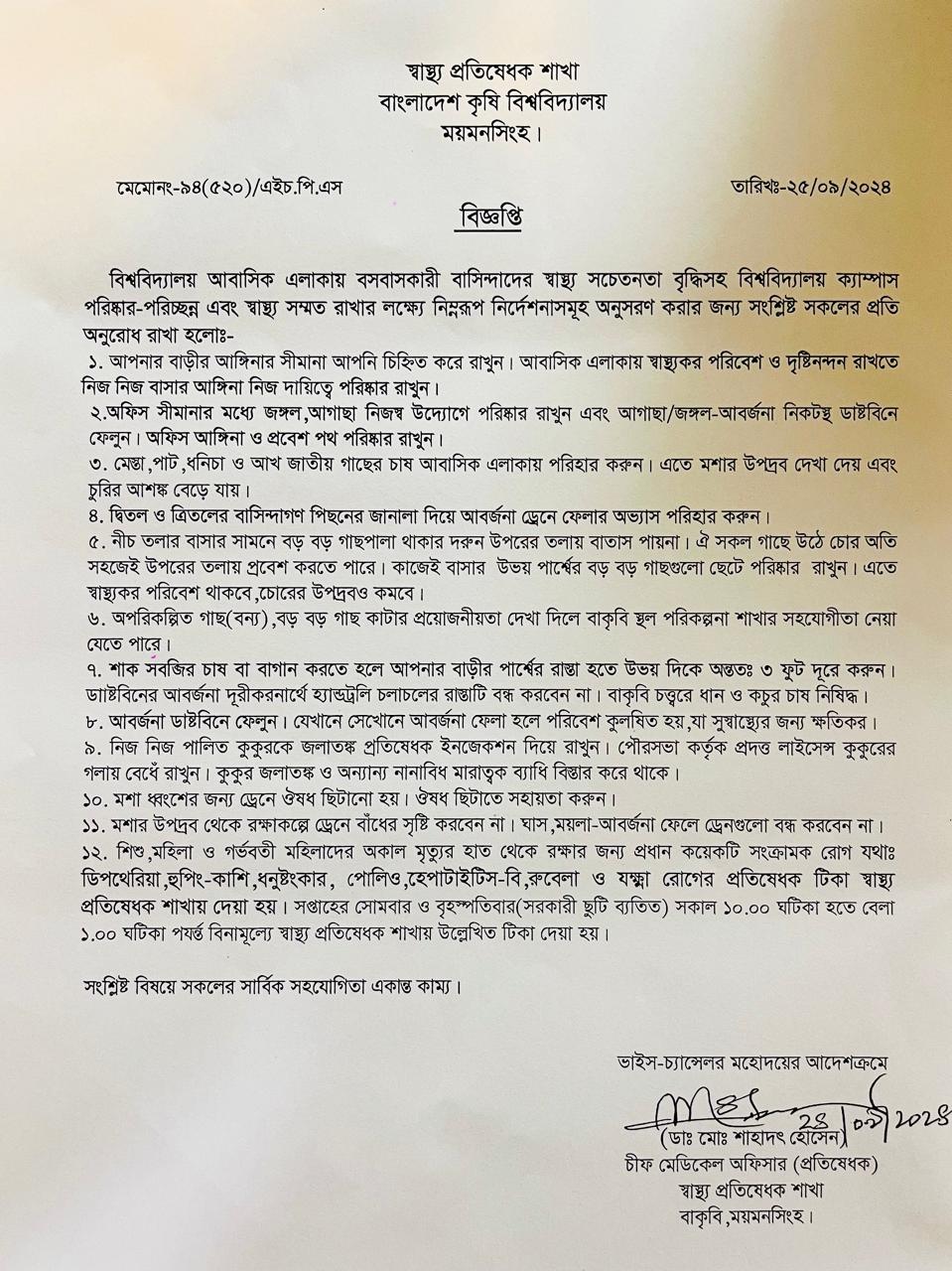 বিশ্ববিদ্যালয়ের আবাসিক এলাকায় বসবাসকারী বাসিন্দাদের স্বাস্থ্য সচেতনতা বৃদ্ধিসহ বিশ্ববিদ্যালয় ক্যাম্পাস পরিষ্কার-পরিচ্ছন্ন রাখার লক্ষ্যে বিশ্ববিদ্যালয়ের নির্দেশনাসমূহ :