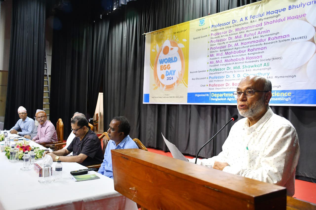 বাংলাদেশ কৃষি বিশ্ববিদ্যালয়ের পোল্ট্রি বিজ্ঞান বিভাগের আয়োজনে দিবসটি পালন উপলক্ষে সোমবার (২১ অক্টোবর ২০২৪ ) সকাল ৯টা ৩০মিনিটে বাকৃবি সরকারি প্রাথমিক বিদ্যালয়ে শিশুদের ডিম খাওয়ানো হয় এবং একটি বর্নাঢ্য র্যালী পশুপালন অনুষদীয় গেইট থেকে শুরু হয়ে ক্যাম্পাস পদক্ষিন শেষে সৈয়দ নজরুল ইসলাম সম্মেলন কেন্দ্রে এসে শেষ হয়।পরে দিবসটি পালনে পোল্ট্রি বিজ্ঞান বিভাগের প্রধান প্রফেসর ড. বাপন দে'র সভাপতিত্বে সৈয়দ নজরুল ইসলাম সম্মেলন কেন্দ্রে সকাল ১১.০০ টায় অনুষ্ঠিত 'বিশ্ব ডিম দিবস ২০২৪ উদযাপন 'অনুষ্ঠানে প্রধান অতিথি হিসাবে উপস্থিত ছিলেন বাকৃবির ভাইস-চ্যান্সেলর প্রফেসর ড. এ.কে. ফজলুল হক ভূঁইয়া। এছাড়া বিশেষ অতিথি ছিলেন ছাত্র বিষয়ক উপদেষ্টা প্রফেসর ড. মোহাম্মদ শহীদুল হক, পশু পালন অনুষদীয় ডীন প্রফেসর ড. মো: রুহুল আমীন, বাউরেস পরিচালক প্রফেসর ড. মো: হাম্মাদুর রহমান, ইউজিসি প্রফেসর ড. এস.ডি. চৌধুরী, ডীন ভেটেরিনারি অনুষদ প্রফেসর ড. মো: আবদুল আউয়াল ,শিক্ষক সমিতির সভাপতি ও ডীন মাৎসবিজ্ঞান অনুষদ প্রফেসর ড. মো: রফিকুল ইসলাম সরদার। এছাড়াও অনুষ্ঠানে অনলাইনে যুক্ত ছিলেন বাংলাদেশ ব্রিডার্স এসোসিয়েশনের সভাপতি মো: মাহাবুবুর রহমান, বাংলাদেশ এনিম্যাল হাজবেন্ড্রি সোসাইটির প্রেসিডেন্ট মো: মাহাবুব হাসান।অনুষ্ঠানে স্বাগত বক্তব্য রাখেন প্রফেসর ড.সুবাস চন্দ্র দাস ,মূল প্রবন্ধ উপস্থাপন করেন প্রফেসর ড. মো: শওকত আলী এবং কি-ডিসকাসেন্ট হিসেবে ইউজিসি প্রফেসর ড. এস.ডি. চৌধুরী বিস্তৃত আলোচনা করেন। ভাইস-চ্যান্সেলর প্রফেসর ড. এ.কে. ফজলুল হক ভূঁইয়া তার বক্তব্যে ডিমের উৎপাদন ও বিপণনের বিকাশে জাতীয় এবং আন্তর্জাতিক পর্যায়ে রিসার্চ এন্ড ডেভেলপমেন্ট (আর এন্ড ডি) এর প্রয়োজনীয়তার বিষয়ে গুরুত্ব আরোপ করে বলেন '' ডিম হচ্ছে সহলভ্য প্রকৃতপক্ষে একটি ব্যালেন্সড খাবার"। তিনি এই খাতে সংশ্লিষ্ট সকলকে অভিবাদন জানন। এছাড়া তিনি স্কুলের বাচ্চাদের প্রতিদিনের টিফিনে অবশ্যই অন্ততপক্ষে ১টা ডিম রাখার পরামর্শ দেন। তিনি ডিমের উচ্চ খাদ্যমানকে কাজে লাগাতে সহনীয় মূল্যের মধ্যে ডিম এবং আলু-সবজিসহ একটি সুস্বাদু ডিমের মেন্যু প্যাক সবার জন্যে বাকৃবির টিএসসি কেন্টিনে রাখার ব্যাপারে ছাত্র বিষয়ক উপদেষ্টা এবং পোল্ট্রি বিজ্ঞান বিভাগের প্রতি আহবান জানান। তিনি তাঁর বক্তব্যে আমদানিকৃত ডিম নয় বরং ডিম উৎপাদনে স্বয়ংসম্পুর্নতা অর্জনের ওপর বিশেষ গুরুত্ব আরোপ করেন।