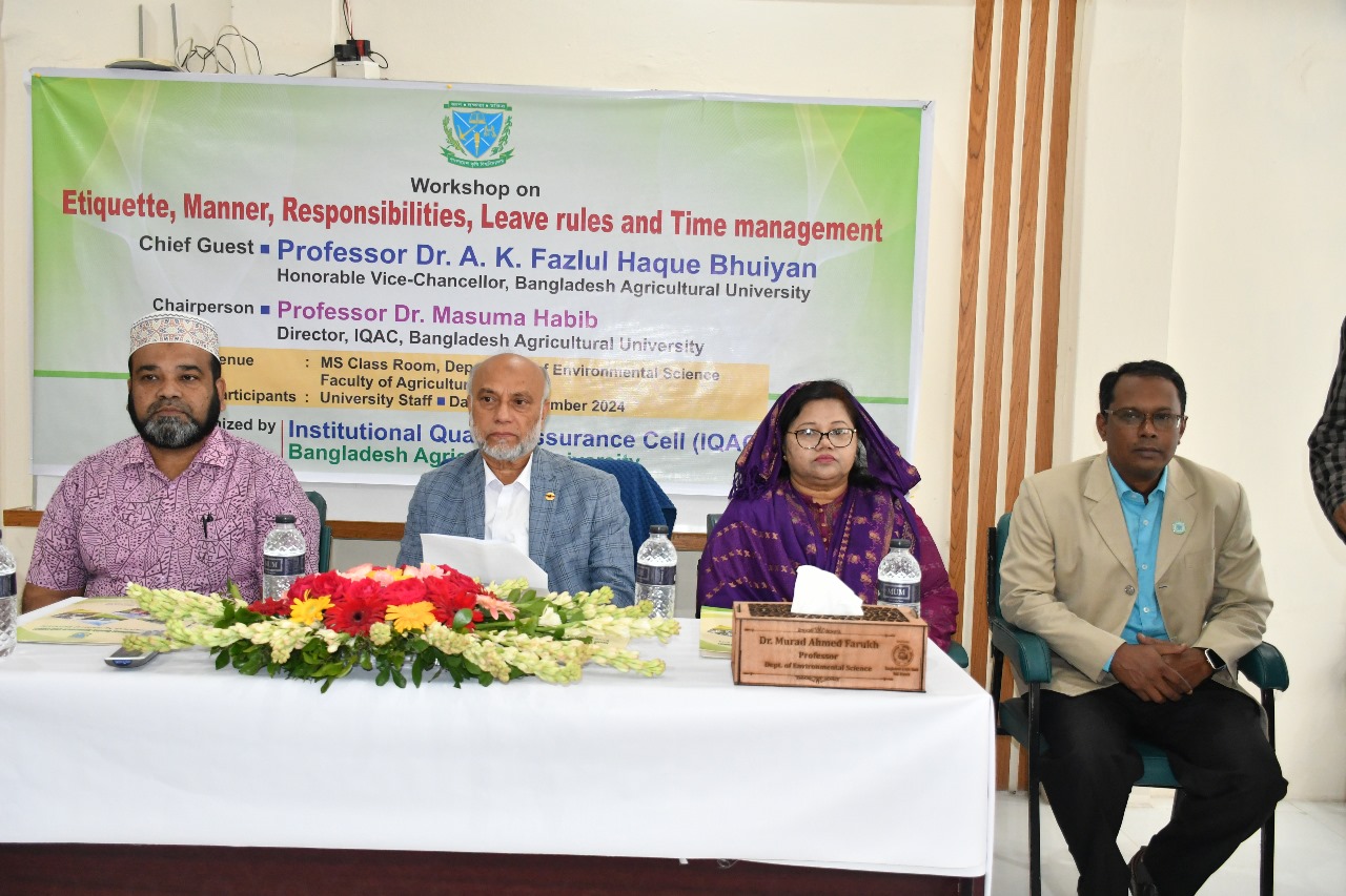 বাংলাদেশ কৃষি বিশ্ববিদ্যালয়ের ইনস্টিটিউশনাল কোয়ালিটি এসু্রেন্স সেল (আইকিউএসি) কর্তৃক বিশ্ববিদ্যালয়ে কর্মরত কর্মচারীদের জন্য আয়োজিত "এটিক্যাট, ম্যানার, রেসপন্সিবিলিটিস, লিভ রুলস এন্ড টাইম ম্যানেজমেন্ট" শীর্ষক দুই দিন ব্যাপী কর্মশালার উদ্বোধনী সোমবার (১৮ নভেম্বর ২০২৪) সকাল ১০টায় কৃষি অনুষদের পরিবেশ বিজ্ঞান বিভাগের এম.এস. ক্লাস রুমে অনুষ্ঠিত হয়েছে। আইকিউএসি এর পরিচালক প্রফেসর ড. মাছুমা হাবিবের সভাপতিত্বে অনুষ্ঠানে প্রধান অতিথি হিসাবে উপস্থিত ছিলেন বাকৃবির ভাইস-চ্যান্সেলর প্রফেসর ড. এ কে ফজলুল হক ভূঁইয়া। আইকিউএসি'র অতিরিক্ত পরিচালক প্রফেসর ড. মুরাদ আহমেদ ফারুখের সঞ্চালনায় অনুষ্ঠানে স্বাগত বক্তব্য রাখেন অতিরিক্ত পরিচালক-আইকিউএসি প্রফেসর ড. মোঃ শাহেদ রেজা। প্রধান অতিথির বক্তব্যে ভাইস-চ্যান্সেলর ড. এ কে ফজলুল হক ভূঁইয়া শুরুতেই ২০২৪ সনের জুলাই-আগস্টে বৈষম্যবিরোধী ছাত্র-জনতার গণআন্দোলনে যারা শহীদ হয়েছেন এবং যারা আহত হয়ে পঙ্গুত্ব বরণ করেছেন এবং এখনো যারা হাসপাতালে চিকিৎসাধীন আছেন তাদের প্রতি গভীর শ্রদ্ধা ও সমবেদনা প্রকাশ করে এই আন্দোলনে জড়িতদের পাশে থাকার এবং সুযোগ হলে সাধ্যমতো সবাইকে পাশে দাঁড়াবার আহবান জানান। তিনি এই প্রতিষ্ঠানের ভাবমূর্তি বজায় রাখতে এবং সঠিক সময়ে সবাইকে অফিসে আসতে নির্দেশনা প্রদান করেন। তিনি বলেন চকুরীতে প্রত্যেকটা শ্রেণীরই গুরুত্বপূর্ণ এবং প্রত্যেকেরই আত্মমর্যাদা আছে, সেজন্যে সবাইকে চাকুরীবিধি মেনে চলার জন্যে আহবান জানান। তিনি যে সকল কর্মচারীদের জন্যে ড্রেস-কোড বহাল আছে তাদেরকে তা মেনে চলার নির্দেশনা দেন। তিনি এই কর্মশালার সাফল্য কামনা করেন এবং বিশ্ববিদ্যালয়কে সামনের দিকে এগিয়ে নেয়ার লক্ষ্যে আইকিউএসি'র ট্রেনিংয়ের মাধ্যমে কর্মচারীদের অফিসের পরিবেশ উন্নত থেকে উন্নততর করার আহবান জানান।আইকিউএসি'র পরিচালক প্রফেসর ড. মাছুমা হাবিব বলেন সকল কর্মচারীকে এই প্রশিক্ষণের মাধ্যমে সম্পৃক্ত হতে হবে এবং এই বিশ্ববিদ্যালয় তথা সমাজকে বদলে দিতে হবে।